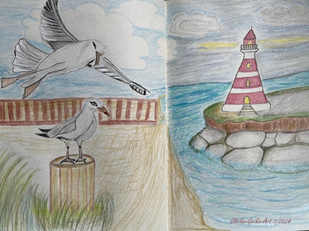 Im Skizzenbuch halte ich die Inspirationen aus meinem letzten Urlaub fest. Ich übe, alles aus dem Kopf heraus zu zeichnen. Zuerst eine Möwe auf einem Holzpfahl. Wie zeichnet man eine Möwe im Flug? Vielleicht sind die Proportionen nicht ganz richtig. So könnte es aussehen, wenn sie kurz vor der Landung anfliegt.